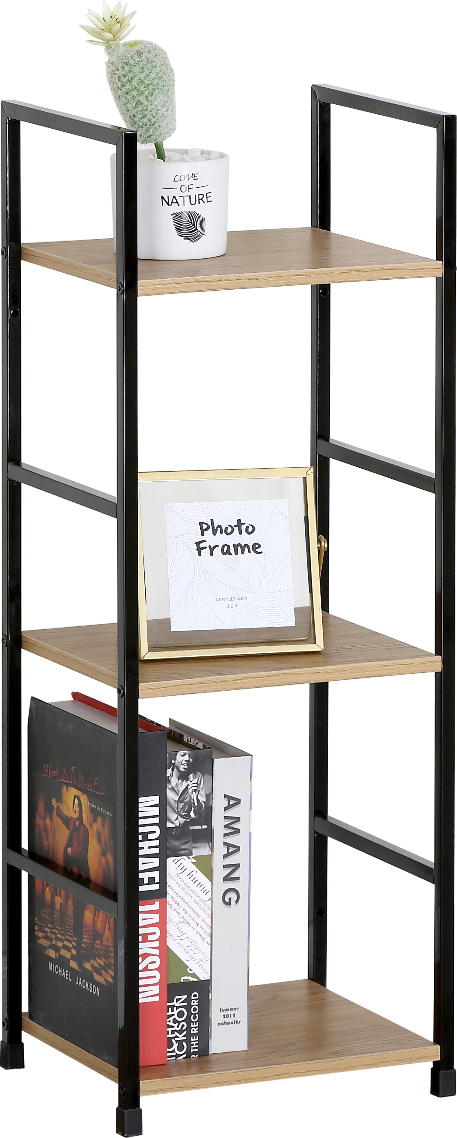 Металлический каркас подчёркивает индустриальный характер модели, а открытая конструкция с тремя полками создаёт ощущение лёгкости и порядка. Стеллаж отлично подойдёт для размещения книг, декоративных элементов, комнатных растений, аксессуаров или предметов повседневного использования.