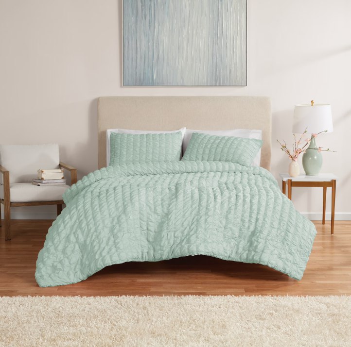 Фактурное покрывало с лёгким объёмом красиво ложится на кровать и делает её аккуратной без лишних усилий — даже в обычный будний день спальня выглядит продуманно и ухоженно. Ткань приятна на ощупь, не выглядит тяжёлой и сохраняет форму, а наволочки в комплекте поддерживают единый стиль.