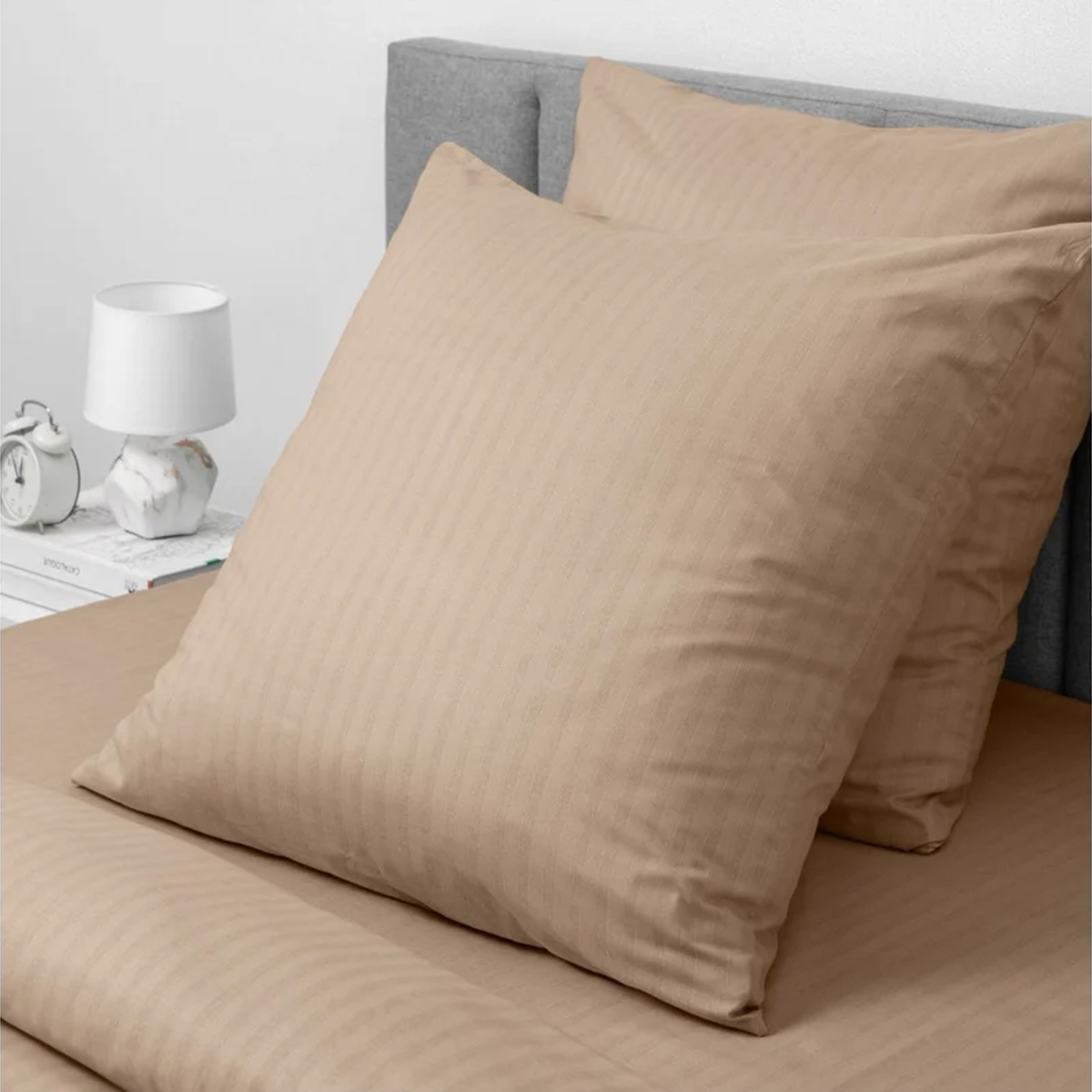 Элегантный страйп-дизайн: Классическая полоска в нежном карамельном оттенке выглядит стильно и визуально увеличивает объем постели.