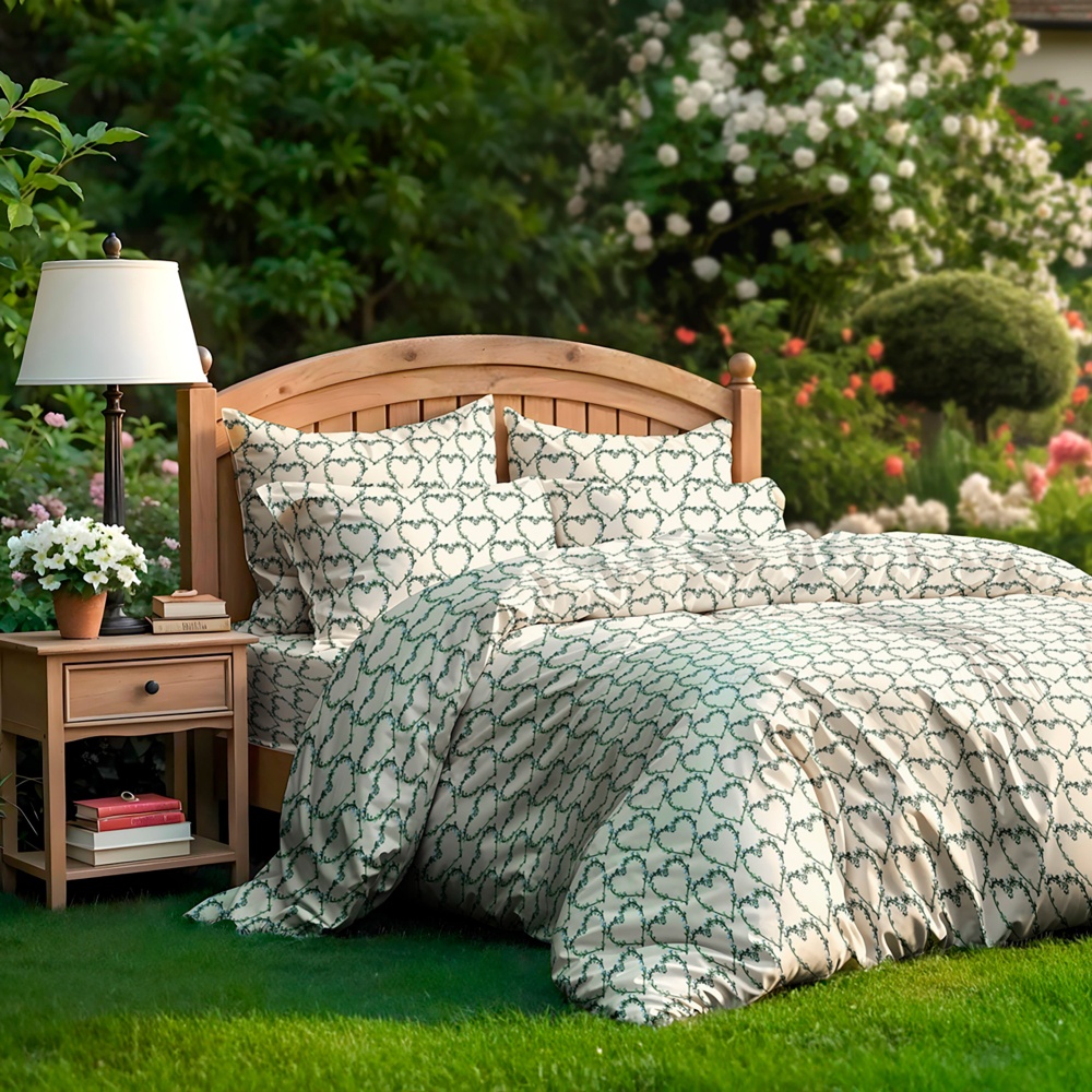 Дизайн Allisum Heart выполнен в нежном романтичном стиле. Принт представляет собой изящные сердечки, сформированные из цветов и веточек аллисума, создающие лёгкий растительный орнамент. Такой рисунок выглядит уютно и воздушно, наполняя спальню теплом и спокойной атмосферой.